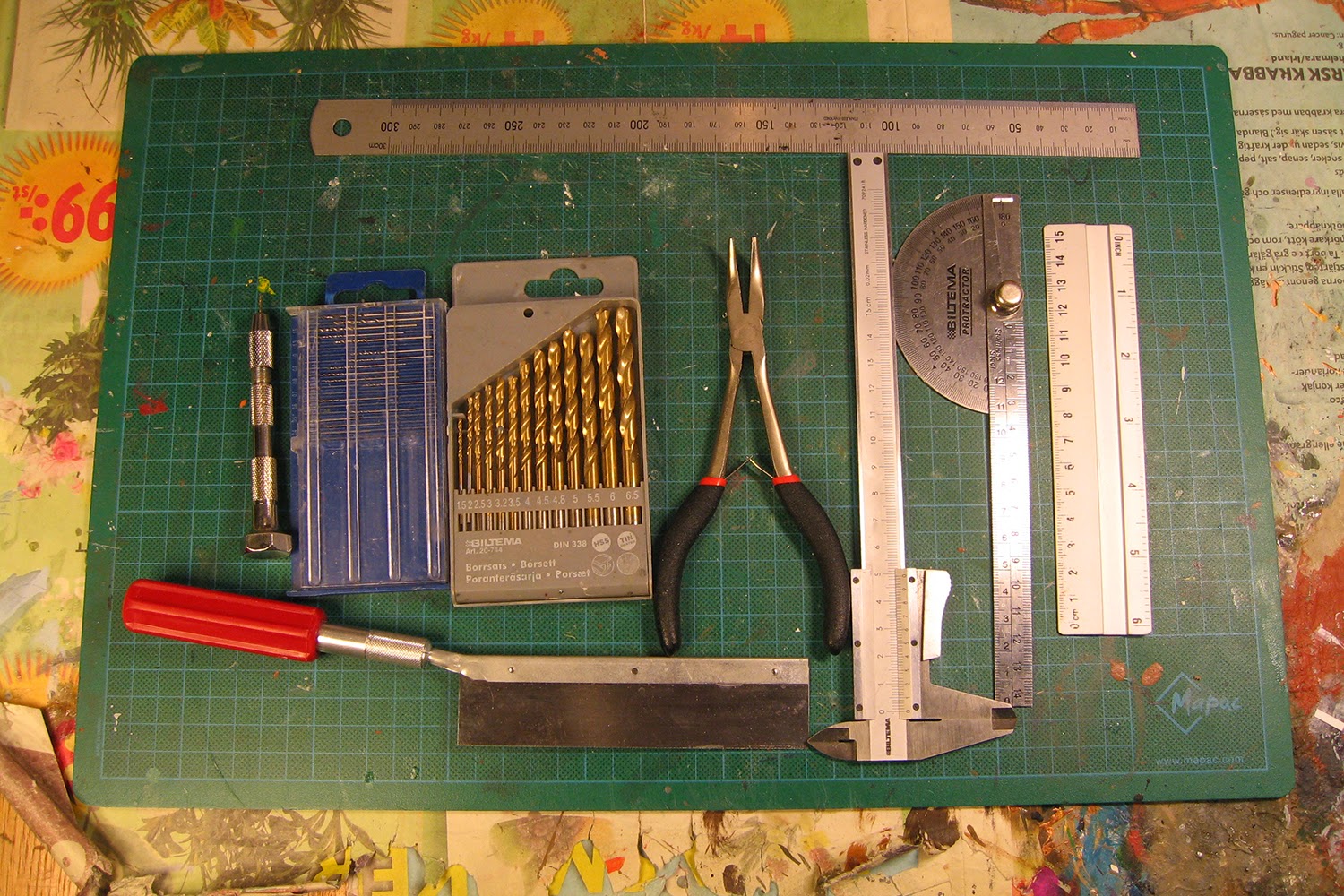 - Measuring tools - A good steel ruler is the bare minimum of what you need. I also use a smaller aluminium ruler (though to be fair it is kind of crappy), a calliper and an angle ruler. The smaller a build is, the higher the precision needs to be.