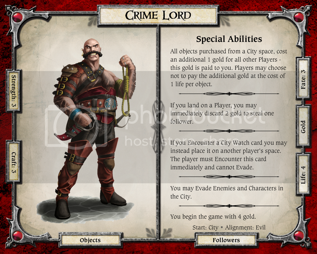 Crime Lord: like the black mo pic best. Needs a The City icon because your saying “may Evade enemies in the city” interesting indeed love the “City Watch” ability but there are 2 law enemy in the City so it would be better if you said “Night Guard” instead or even both. I think the evade enemies in the city is a bit rude, what about “must encounter characters in the city and can evade enemies but may never enter a shop in the city” thus giving him right of way in the city with limiting him from gaining nasty items followers but also allowing him to pick on other characters in the city. Needs more thought in abilities but great idea would be interested in trying to work out a better working character.