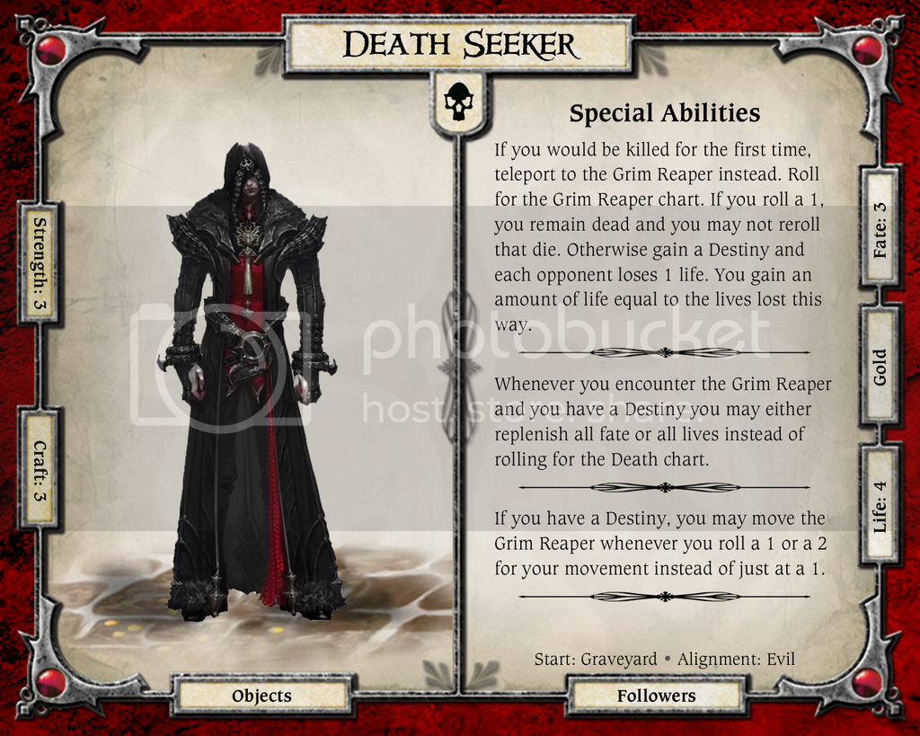 If you would be killed for the first time, teleport to the Grim Reaper instead. Roll for the Grim Reaper chart. If you roll a 1, you remain dead and you may not reroll that die. Otherwise gain a destiny and each opponent lose 1 life. You gain an amount of life equal to the life lost this way. After that if you are somehow still are at 0 life, you stay dead.