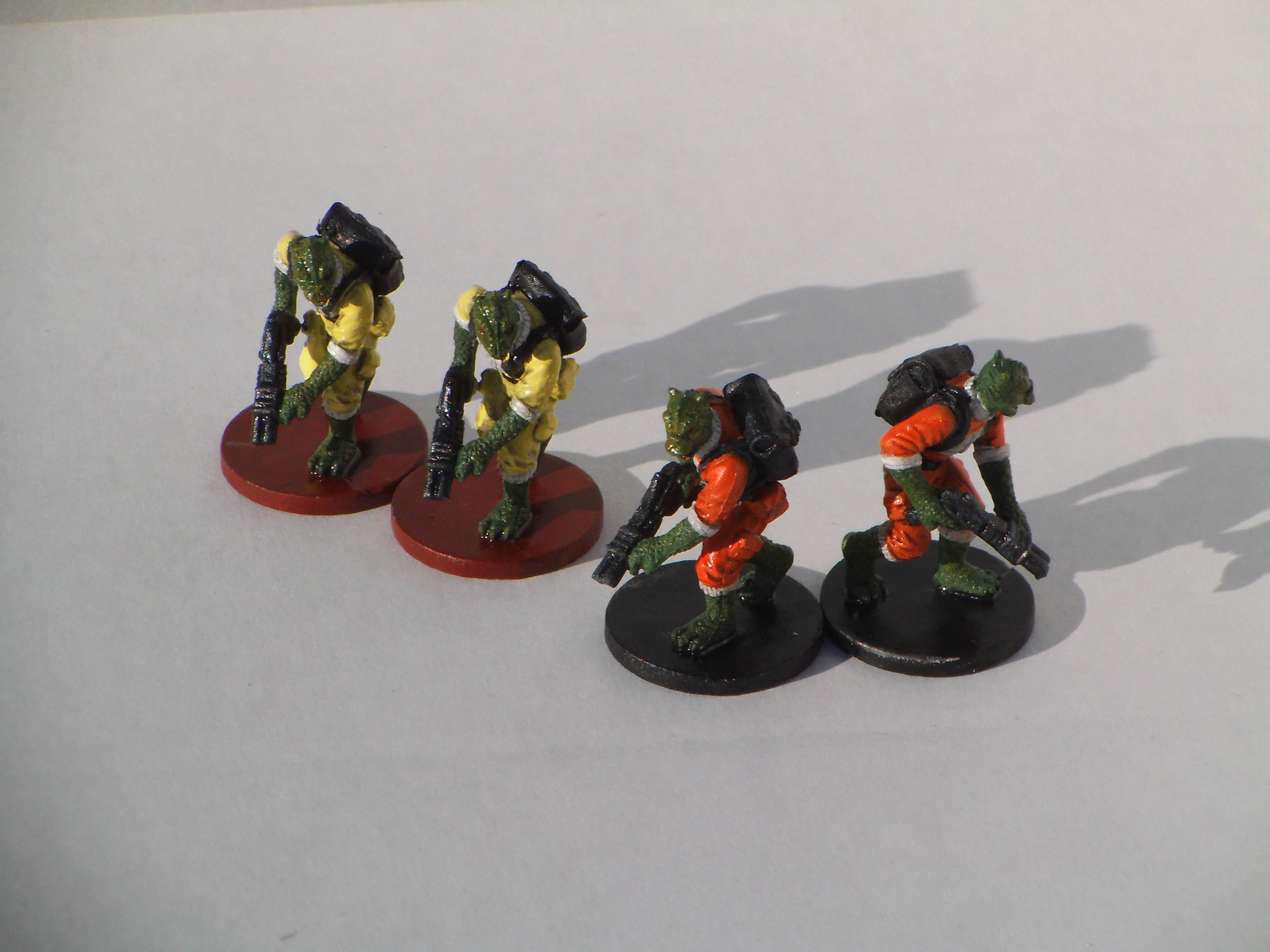 So this is my first time ever even owning a miniatures game, and certainly my first time painting minis. Because of the cost I had to go cheap. I got some inexpensive brushes from Walmart and mostly Apple Barrel paints. I used floor polish to cut the paint and to seal the minis up (I actually like the glossy look). I did the best I could to follow some of Sorastro's guides and used some other info I found online.