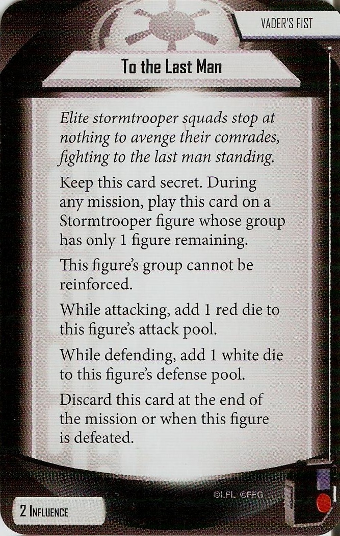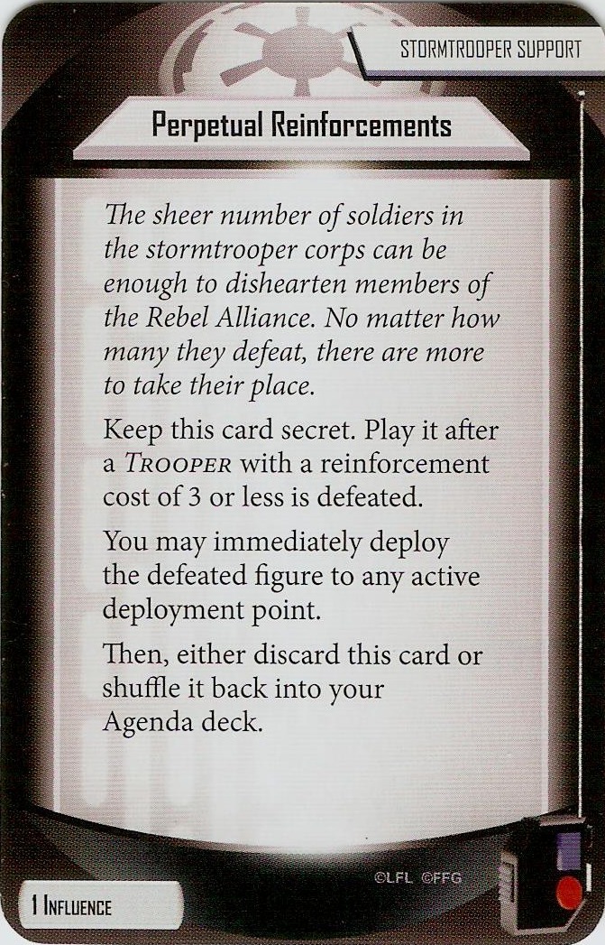 Ok, let me clarify, Perpetual Reinforcements is designed to be used *before the last unit of a group is defeated. In this example, we have a group of Stormtroopers with 2 out if 3 troopers deceased. We play the Last Man Standing card, then play PR, adding a second trooper to the existing group without reinforcing the unit as per the RRG.
