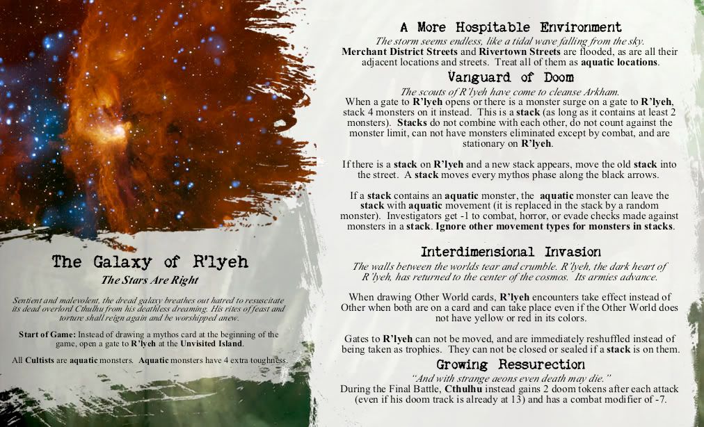 I love the idea that Arkham is flooding as part of Cthulhu's return. That's a thematic punch to the face I didn't think of in mine, and makes aquatic monsters much more important. Very cool.