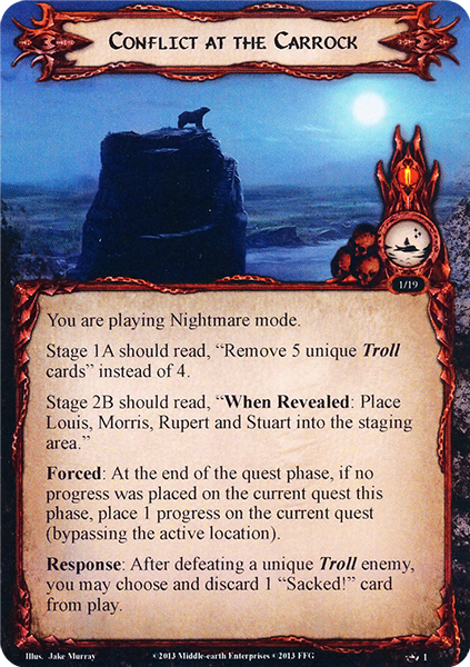 The quest card has 2 quest points. Clearly you're intended to progress to stage 2 at the end of the 2nd planning phase. But the way it is worded, shouldn't Pelennor Fields act as a buffer for the quest, meaning you actually get 5 rounds of setup before you have to advance? This question came up way back in 2012 about the Abandoned Tools card and Flight from Moria quest. Nate French gave this answer, which is reported in the thread here: