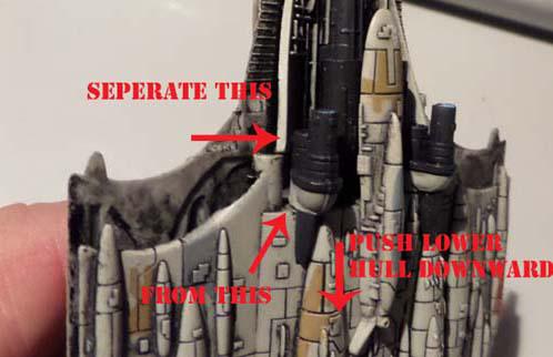 You have to twist the screwdriver around the ship maybe two times or more, little by little, to make sure that the pegs is separated evenly inside the ship so you don’t break anything. Remember that the fit is really tight so you'll have to use some controlled strength. When the spring is big enough to get a coin through (metaphor) you can opt to start slowly to bend “open” the front 3/4ths of the ship. Now STOP here. Don’t break the ship apart yet as the engine cluster is holding the ship halves together in the rear with a bulkhead Marked B (bottom) and an “engine roof” Marked C (top).