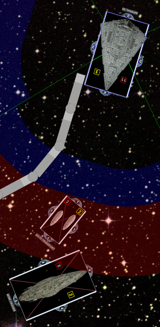 I'll add that it would be smarter for the ABT, realizing it won't get its attack run in by going to our left to position itself to our right to try to catch the HMC80 in its front arc at the bottom of the next turn. That would likely succeed, but the HMC80 would be able to position itself to only be in one arc and the ABT would be unable to subsequently set up a double arc. The end result would be a front arc at the bottom of the next turn (likely at medium range) followed by another front arc likely at the top of the following turn, only one of which benefits from Avenger and Boarding Troopers (likely the second attack at close range). That's intimidating, but not likely to destroy the HMC80, which can then make a getaway into/past the side arcs of the ABT.