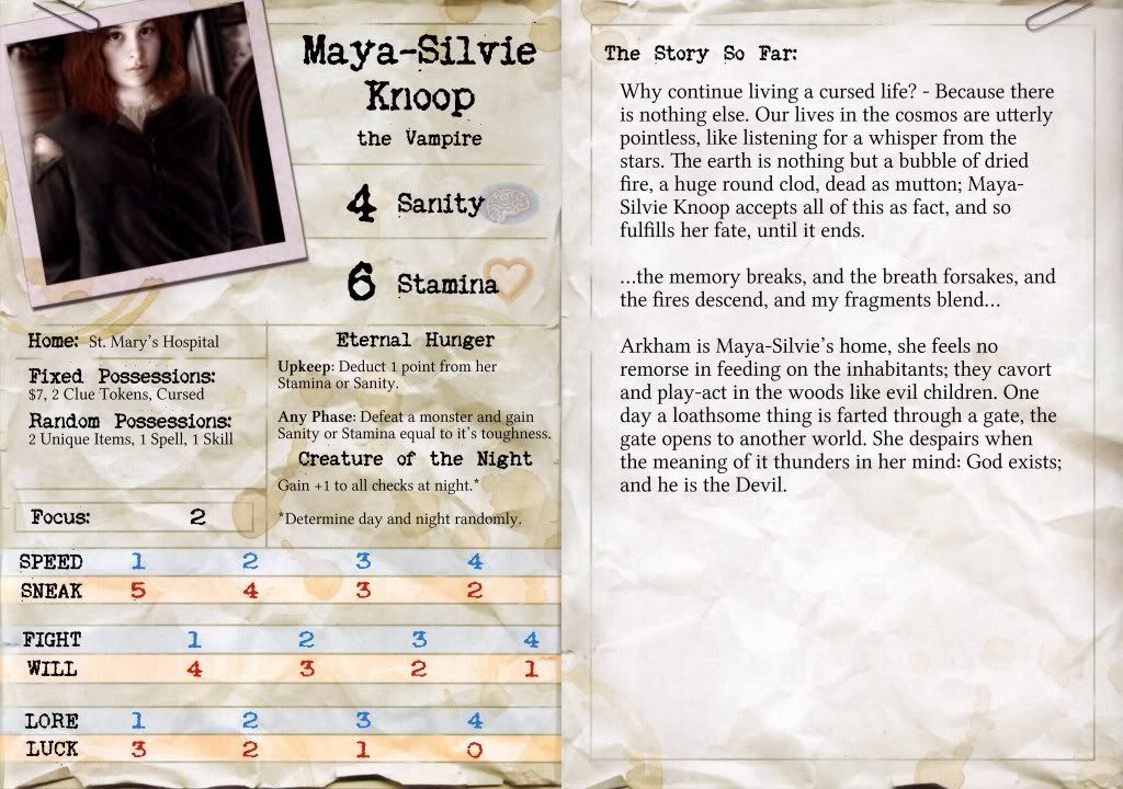 The first one is a bit too weak. A clue token for sanity or stamina? bad deal. His second ability doesn't make sense- how can someone be devoured while litas? if someone is reduced to both 0 sanity and staimna while in an other world he's simply devoured. he doesn't get sent to liats and then devoured. The second one is alright, I guess, although .357 gives +10 to combat checks...