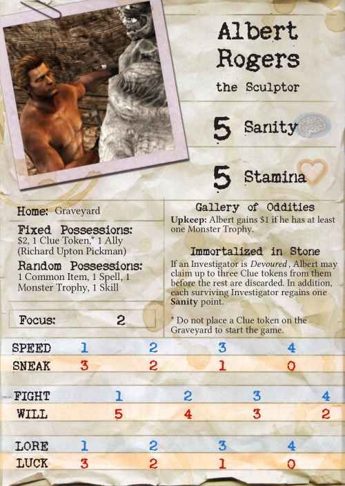 Albert Rogers - Cleaner and better for sure, but still suffers from a couple of the same problems. At this point, the two things I'm still a little irked with are starting with a fixed ally and starting with a monster trophy at all given his first ability. If you really must start him with an ally, I would recommend making it a random ally. If you look at the normal investigators, not a single one starts with a fixed ally except Ashcan Pete, who starts with one of the "lesser" allies (Duke). Anyone else that has one (which is very few) is limited to a random ally, which is still an amazing thing to start with but might not always be optimal. When you make it fixed, not only do you guarantee a near optimal ally but you also take away some of the fun in what could be a nice surprise factor. If it must be RUP for personal reasons, I'm not gonna argue with ya, but I've given my two cents. As for the other issue, I would just take away his starting monster trophy, thus giving him a reason to go fight things. He is so much more rewarded killing a monster on the board if it's his first one, but the rewarding sensation doesn't exist if he already starts the game winning.