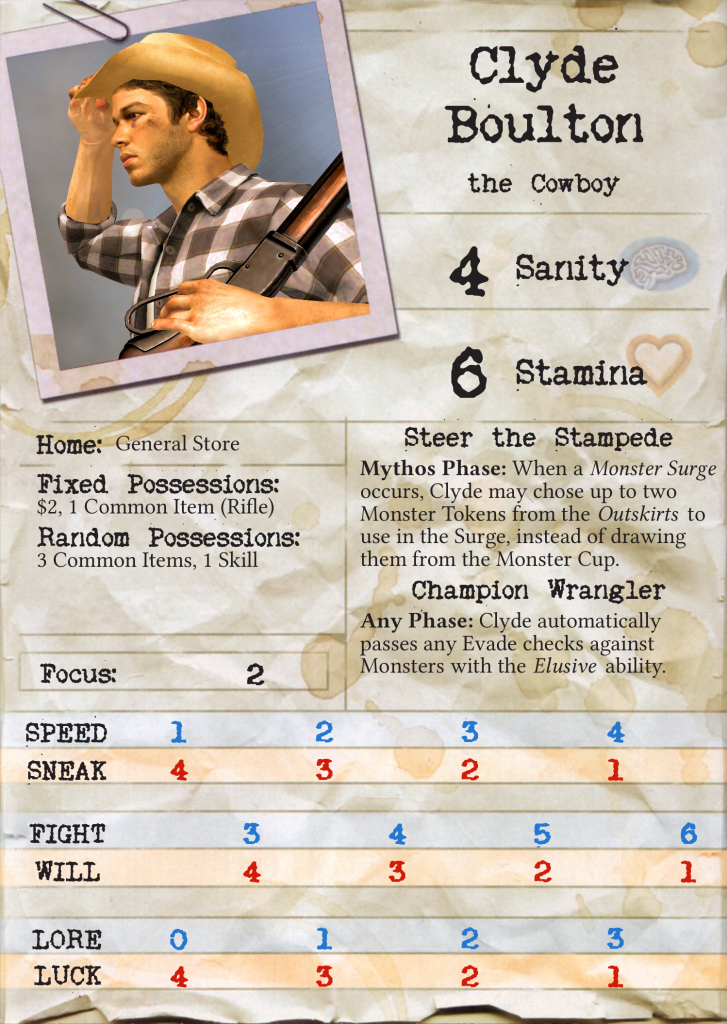 So yeah, my theory is this--play it like an RPG. Characters start with basic gear tooled towards their skill set but are left room to need better gear later on as things get more dangerous. I've played Clyde once and got relatively lucky using him a party of three. The Outskirts issue arose twice due to bad Mythos drawing but was helpful in getting him targets he could handle at that point in time.
