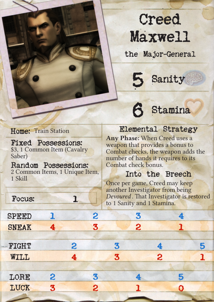 I put this guy into my own thread, but I'm placing him here for a closer look for a second opinion. It's mostly on his special ability. I've played through the game twice with this guy and found that a problem arose mostly with Sanity issues--that is, even passing Horror checks, he still had issues when facing down Nightmarish critters. Beyond that, I don't know if his particular abilities could be exploited in some way I'm missing.