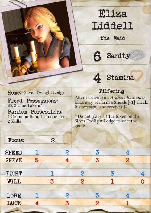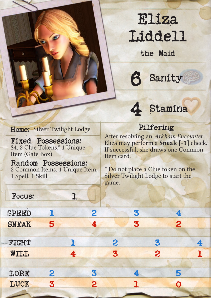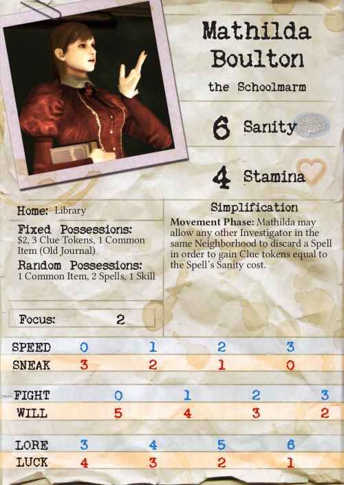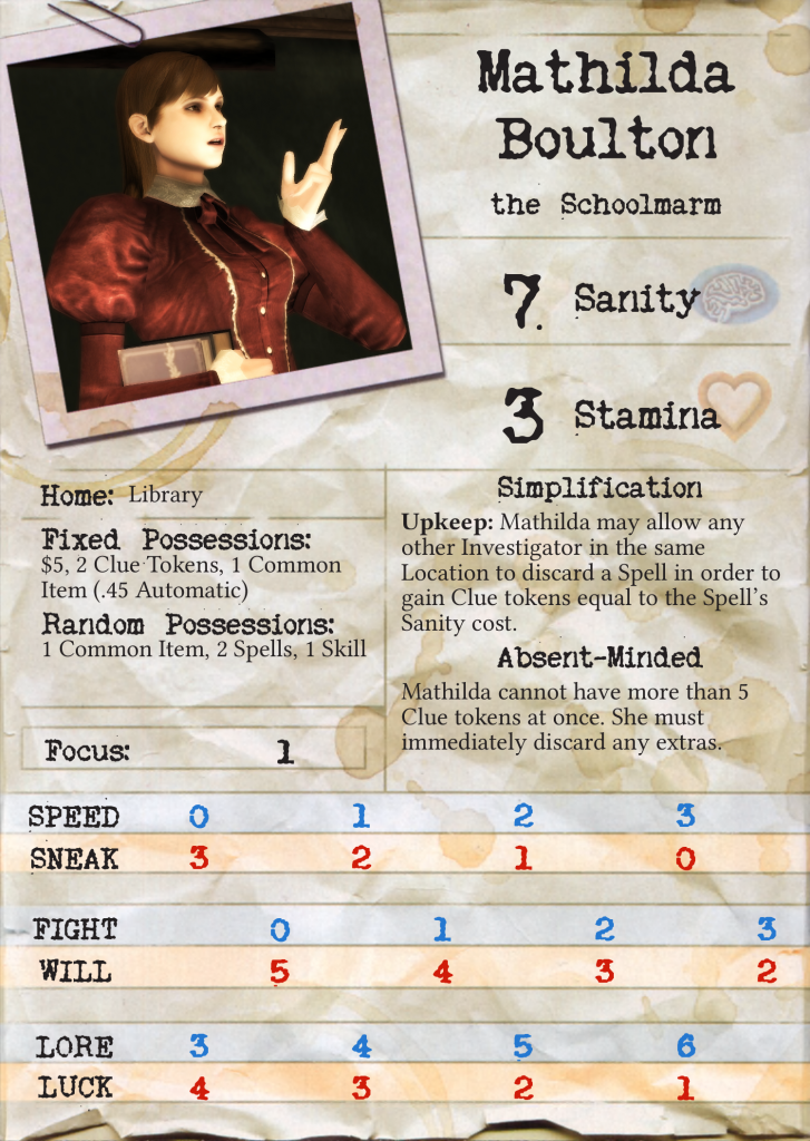 Mathilda Boulton: She's not overpowered or underpowered in any regard, but I don't like her. She's can do a lot of little things, but she's not really good at any one thing in particular. Starting with a 45 Automatic encourages the ability to fight, but being at 3 stamina means she really can't afford to take a hit. Being able to turn spells into clue tokens for other people during upkeep sounds enticing, but most of the time you end up on the negative end of a trade since spells will only be able to give 0,1 or 2 clue tokens (and ones that would give 2 are usually worth keeping, except Spectral Razors and maybe a couple others) . That alone doesn't mean you shouldn't turn useless spells into clues, but the ability is extremely narrow AND requires you to make some sacrifices ( namely, forcing both people in the same place for Upkeep ). Finally, she' can't have more than 5 clues ever, which is fine but doesn't make sense since I thought she was a teacher, a theme you rectified with her first ability. She's not especially bad, but I think you should sit down and try to narrow her role down a bit. Small touches I would recommend are allowing her first ability to be used during Movement as long as both people are in the same area instead of during Upkeep in the same area, and if you really want to keep her second ability make it something different like "can't gain more than 1 clue token per turn".