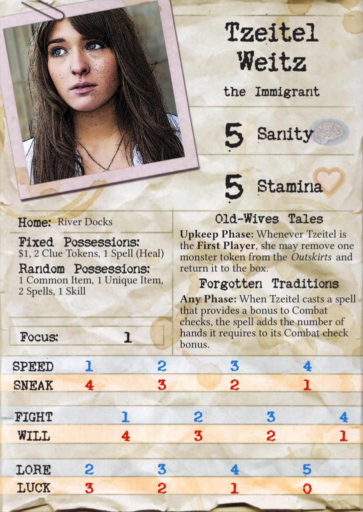 Tzeitel Weitz: Seems fine. Obviously change her second ability to be something a bit more interesting, but her first ability is neat. Changes that come to mind are giving back that stat point you took away (Ability penalty doesn't need to be -1 for this, 0 is fine) and changing the first ability name to something that makes more sense for the ability (How does an Old Wive's Tale cause monsters to suddenly leave Arkham forever?)