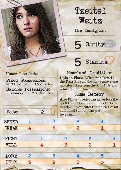 Tzeitel Weitz - Okay, somehow I'm actually more creeped out at this character since the first ability is called "Homeland Traditions", in which the tradition is to walk into the forest and sacrifice an eldritch being. The new second ability is good and interesting, but unfortunately needs a couple of clarifications. Like, do the investigators need to be in the same area, the same neighborhood, the same world? The text is a little ambiguous right now, so I read it as "I can cast heal while in Arkham, and split it with investigators in Other Worlds". If this is your intent, and even if it isn't, note the restrictions in the ability. Otherwise, everything is good.