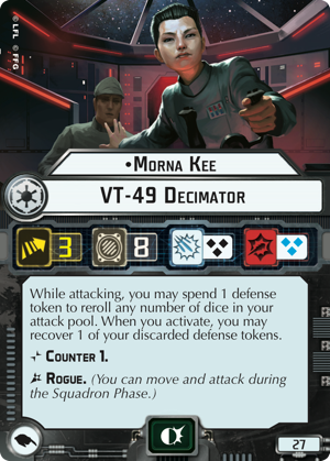 You're telling me! But no, there are answers. First, this list has its fighters doing a LOT of the work. If you can find a way to bog them down ( Biggs and friends , Ketsu , Gallant Haven preventing damage, Valen and Decimators or whatever weird Imperial squadron plan you have) it ends up in a lot more trouble than expected. If you let Maarek , Morna , Jendon and a friend (usually another Defender , but I've seen Boba Fett used too) squish a CR90 a turn, however, well, that's not good for you and starts resulting in problems. Four of the deadliest Imperial squadrons hitting your small ship can really put a dent in it (a dent that may be deadly if Maarek or Boba Fett pull the right crit!) Heck, they can wipe out a lot of the shields from your MC80 too!