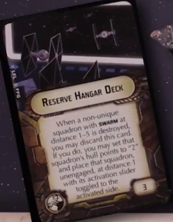 All that said, Imperials have been griping about wanting ship-based squadron assistance to rival Rebels (with Yavaris and Adar Tallon) and this has potential. Resurrecting Swarm squads for 3 points by using up spare offensive retrofit slots (most often found on Raiders, Gozantis, the occasional VSD and ISD) is a pretty sweet deal, even if it's just a generic TIE Fighter. It can also help pad out decisions on what to bring for a small fighter coverage group without having to go too crazy on a fighter-only presence: if you're going mostly MSU and you bring 4 TIE Fighter squadrons and 4 Reserve Hangar Decks, that's 44 points (32+12). If your opponent has no squadrons, that's not too bad. If they do, it's up to 8 TIE Fighter squadrons to chew through (admittedly the second half are 2-hull chumps, but still).