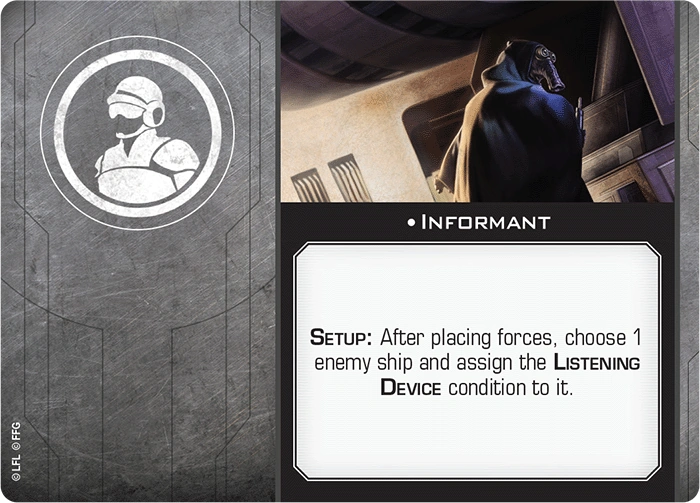 That said, Informant is just 5 points and you can put the Listening Device on whichever ace you're most intent on blocking to death. Sense on Assajj is also a very decent option if you have an excuse to bring her along (and Zuckuss is ideal crew for Lancers). You may have trouble dealing with stressful barrel rolls, but if you predict well it might not be as much of a problem as you would think. It still has six blue maneuvers including the enormous 3-left-bank which can take you crazy places. The two separate options for a turnaround are also extremely sweet on a large-base ship. I believe it's the only large base with a sloop at all.