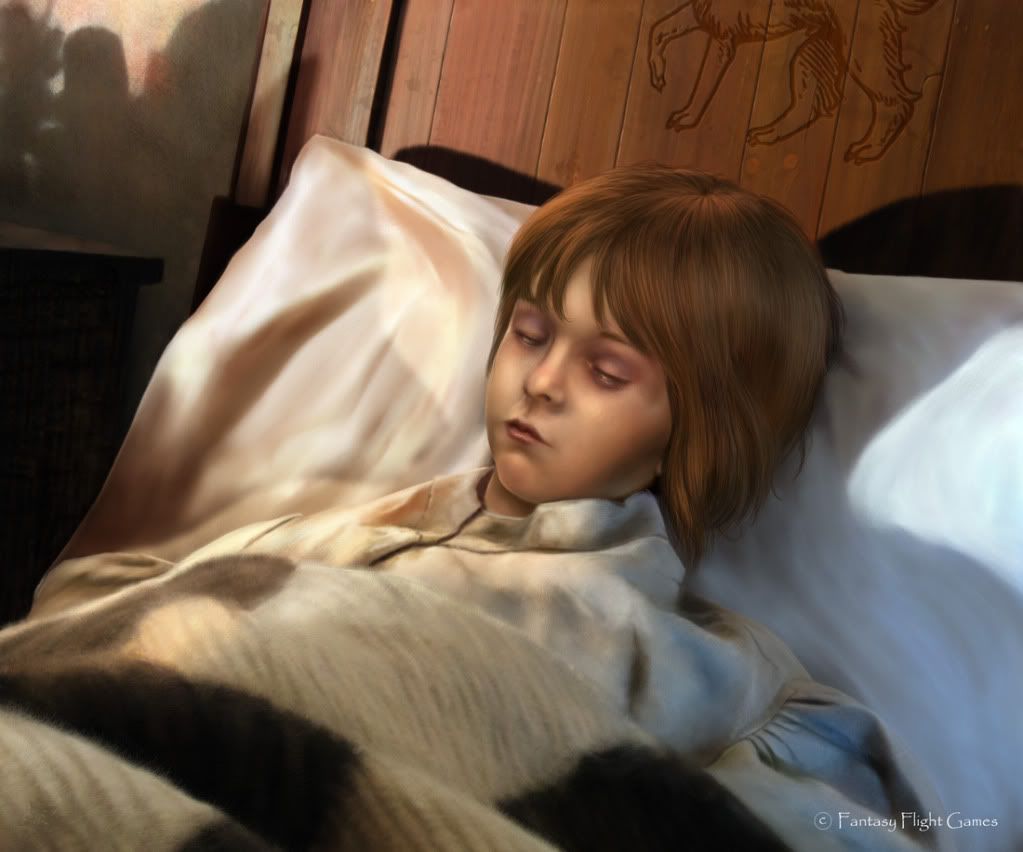 On of my favorite Bran paintings from the game yet. I especially love the Direwolf on the headboard and the lighting and shadows implying it's from the night of the Library Tower fire. It might be my favorite of your ASoIaF paintings.