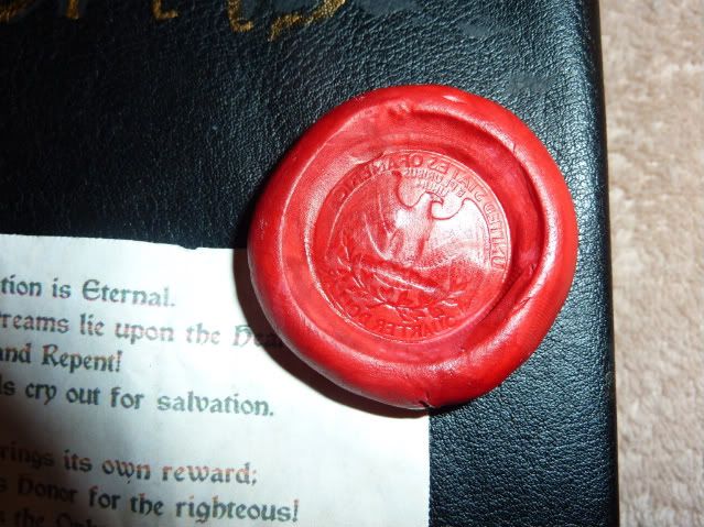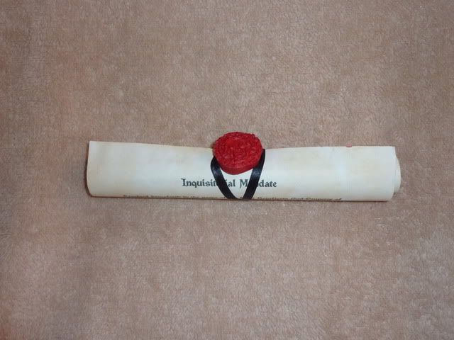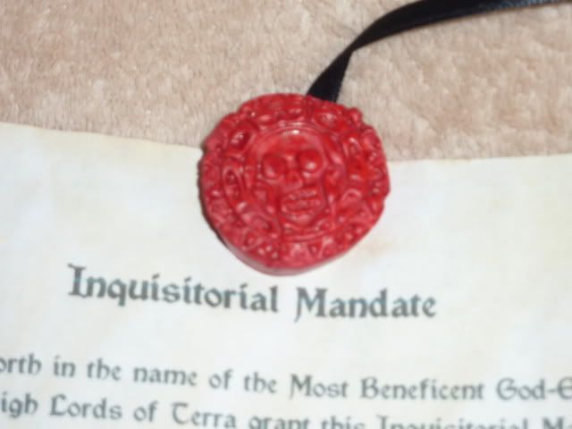 3) This is another of my more simple (but very gratifying) creations. Some of you may recognize the wording of this Mandate - and that would be because it used to be a Rogue Trader Warrant. Now, because of that, and because I am by nature a fairly lazy creature, the writ doesn't read well in some places; but I really didn't make it to read, more to wave around at people. Aged paper, a downloaded gothic font and a few word changes got me a very cool piece of swag. The seal was made in the same manner as the previous ones (why mess with success after all) but was cast from fake pirate coin I had hanging in my car (it's from Pirates of the Caribbean actually), which I then cut carefully out with an exacto knife and painted. You can see in the third picture why both that and the string are there for.