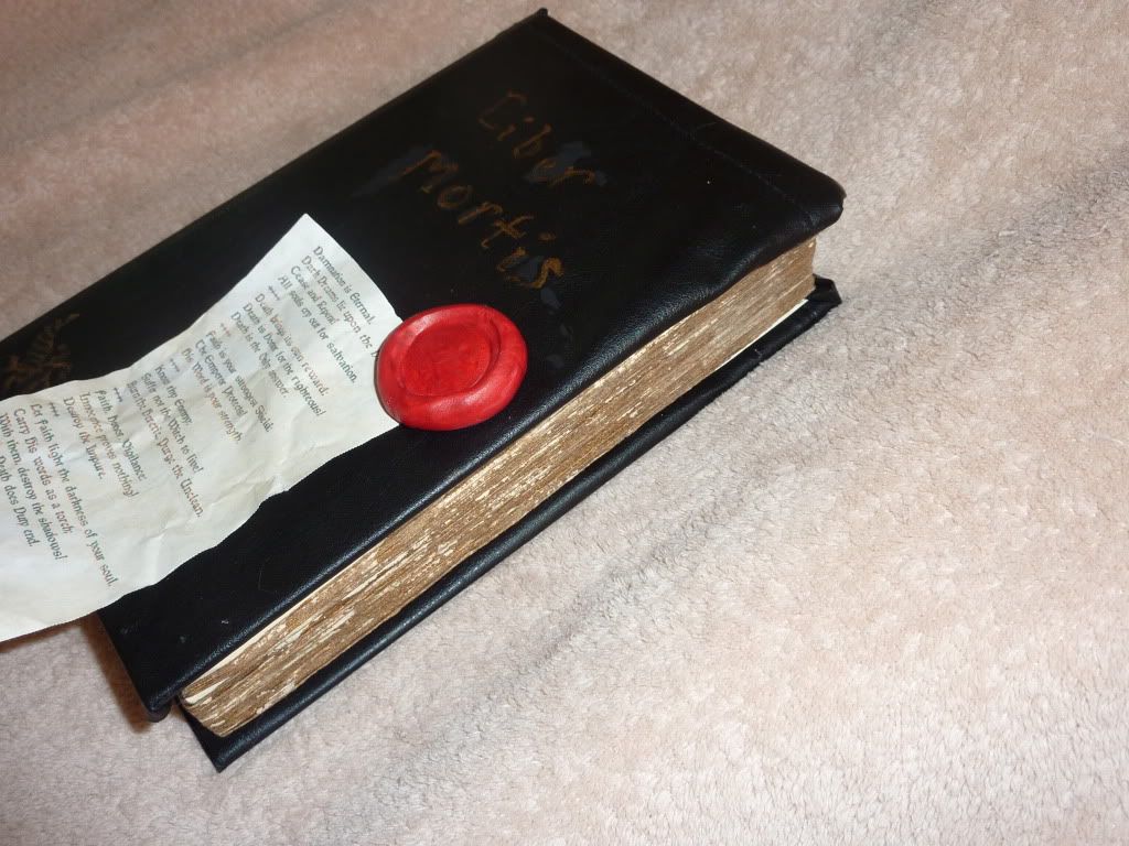 2) This is my personal 'Book of the Dead', in which my character has written various holy incantations of banishment, damnation, etc. The book is a cheap hard-cover I again picked up at the Good-Will (ahh the things you can find in there). I painted the binding in gold acrylic to give it a more aged feel and then I cut up a pair of old leather pants to re-bind the whole thing. As you can see, the top stretched a bit so one of these days I'm planning on ripping that off and redoing it but for the moment it's as it is. I added the book-mark to make it look more like a holy writ as well which I think added a nice little touch of charm. The purity seal was made in the same manner as the first one; however I did write the poem this time, though I again cheated as every line is a quote from a various 40K source. Any American looking at this will also know what the clay was pressed with (A US quarter). I was trying to only get the eagle so I was mildly surprised when the impression came out with the wording too. I didn't think I was pressing that hard.