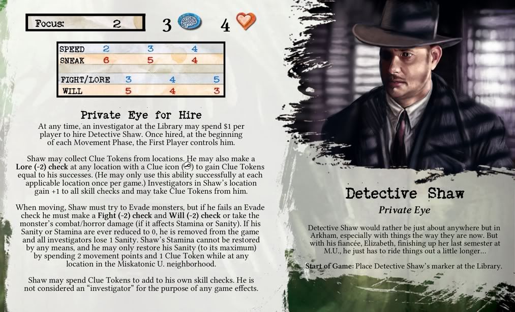 I'm playing around with this idea for a sort of Guardian, sort of Investigator-lite, sort of Ally kind of thing... Still needs work, no doubt. I'm thinking of just having it so he automatically evades all monsters, just to simplify that whole aspect. But I like the idea of him having some kind of stamina/sanity that can be lost. I'd also like a different means of restricting his ability for doing a Lore check to gain a Clue at locations with Clue icons, rather than saying he can only do that once per location... that's hard to track. But if he can just sit somewhere and keep doing that, then he'd probably be too powerful. Anyway, this is a rough first draft, so please let me know if you have any suggestions.
