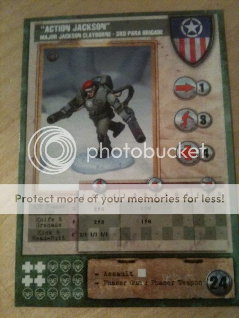 Top card is from the replacement pack with the new point value but has knife and Grenade in place of the second 60W Phaser Gun. The range is also wrong. The bottom card shows the correct weapons.