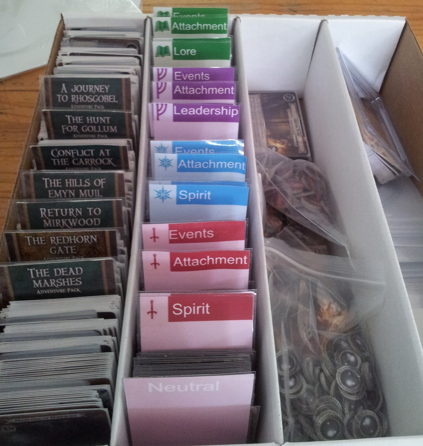 For the Quest/Encounter cards I use a large (800) cardbox with selfmade dividers.