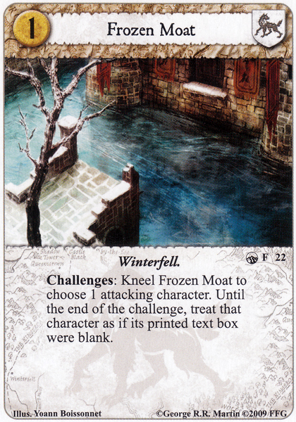 Challenges: Kneel Frozen Moat to choose 1 attacking character. Until the end of the challenge, treat that character as if its printed text box were blank.